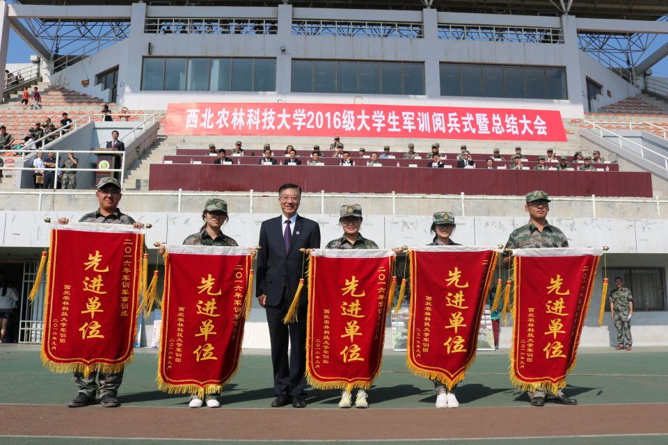 在随后进行的总结表彰大会中,经bat365在线平台官方网站军训团评定,bat365在线平台官方网站最终与葡萄酒学院、资源环境学院、经管学院和机电学院共同被评为2016年军训军事训练先进单位。校长孙其信亲自为受表彰单位授旗,bat365在线平台官方网站2016级辅导员李春华参与了授旗仪式并于校长亲切合影。