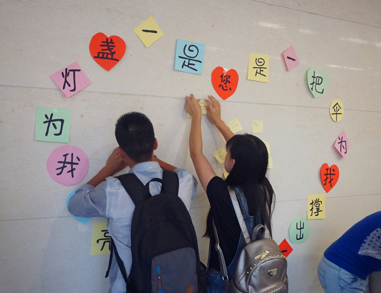“您是一把伞,为我撑起一片天;您是一盏灯,为我照亮人生路。”同学们用彩色卡纸围起心形,在里面用便签纸上写下自己对恩师的祝福。