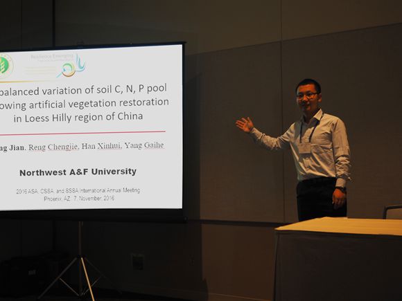任成杰博士在“SSSA Division: Soil Biology and Biochemistry”分会场作了题为“Despite Strong Temporal Responses, Soil Microbial Communities in Afforested Land Are Less Susceptible to Temporal Variability Than That in Farmland.”的学术报告,该研究选择黄土丘陵区典型性人工植被,利用高通量测序技术,揭示植树造林通过改变微生物的群落组成,降低林地中土壤微生物多样性的时间变异,从而提高了森林微生物群落的稳定性,并推测出植树造林对森林生态系统的稳定性有促进作用。