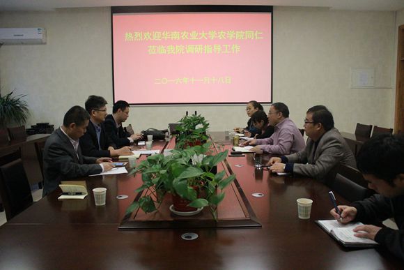 11月18日上午,华南农业大学bat365在线平台官方网站副院长马启彬带队一行4人来学院调研研究生培养、本科教育、学科建设、十三五规划工作,开展研究生招生宣传,与学院师生进行了座谈和交流。学院党委副书记兼副院长张海成、院长助理冯永忠、副院长海江波、办公室相关人员、教师代表出席了座谈会。