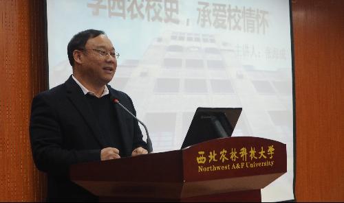 张海成老师向同学们介绍,西农不辱使命,对中国旱区粮食安全,水安全,生态安全不可磨灭的贡献。建国初期,粮食安全关系着国家的安全和稳定。我校的赵洪璋院士研究的小麦品种把关中的小麦亩产从百余斤提升到了近八百斤,极大的缓解了当时的粮食压力。黄淮区小麦品种的六次更新换代,有四次都是西农的贡献。西农对民族的发展做出了不可磨灭的贡献,是农业发展的承重柱。张海成老师又讲到,西农的学科专业在它的发展过程中也正趋于全面。目前,除军事外,其他学科西农都有涵盖,而且还在不断完善,全体师生正努力把西农建设成一个以农林水为特色的综合性大学。