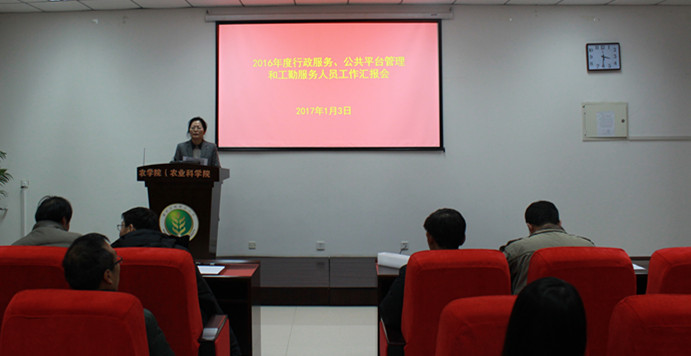 1月3日,bat365在线平台官方网站在216会议室召开了2016年度服务人员工作考评会。考评会由院长单卫星、院党委书记惠安堂等学院领导和各系(中心)主任及教代表20余人担任评委,对服务于学院行政管理、学生管理、作物学创新中心和科研推广等方面的一线服务人员进行了全面考核。服务人员考评会由副院长张蓉主持。