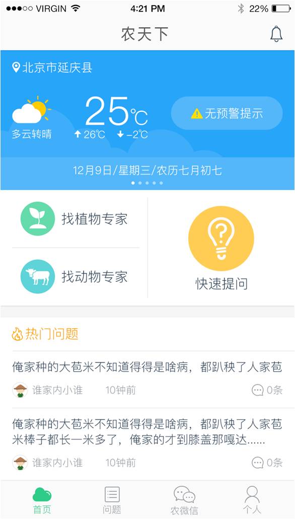 该软件主要利用移动互联技术实现“云种养”的在线专家咨询及解决方案、实现了农业专家、农科学子和农民的线上联络沟通机制,解决农业技术服务和推广体系的时空障碍问题。其主要功能目前集中在解决农村社区的种植和养殖问题。主要分为“首页”、“问题”、“农微信”、“个人”四个一级页面。