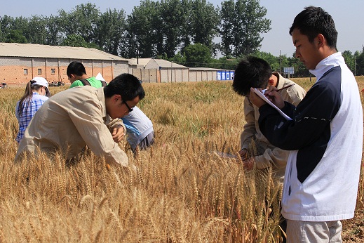 实习期间正处于小麦成熟关键期,穗粒已完全形成,试验站麦田里麦浪滚滚,空气中弥漫着沁人的麦香。在指导教师刘杨副教授、王晓娇博士和徐淑兔博士指导下,学生们开展了小麦收获前农艺性状的调查,亲手进行了小麦株高、穗长、可育小穗数、不育小穗数、穗粒数的测量与计数,学会了条播、穴播两种不同播种方式的小麦产量预测。