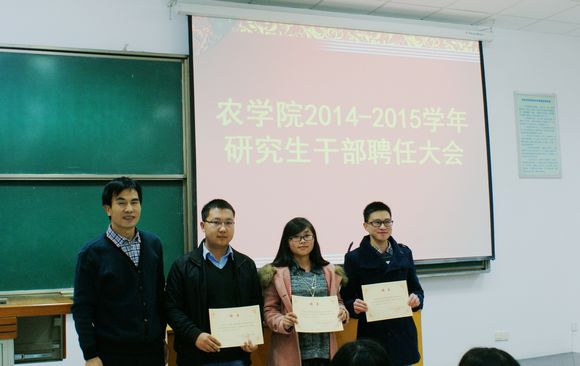 大会宣布了院党委《关于聘任2014-2015学年研究生学生干部的决定》,马志宏副书记为第三届研究生会干部和研究生各班级班长代表颁发聘书。