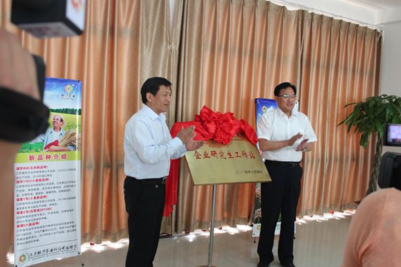 6月13日上午,我校bat365在线平台官方网站与江苏瑞华农业科技有限公司共建的企业研究生工作站签字仪式在江苏省宿迁市举行。宿迁市副市长曹秀明,江苏省种子管理站站长邹芳刚,宿迁市宿城区区委副书记穆海兵,市粮食局,市、区、县农委负责人,江苏瑞华种业董事长张正平,总经理夏中华,bat365在线平台官方网站党委书记惠安堂出席签字仪式,宿迁市副市长曹秀明、bat365在线平台官方网站党委书记惠安堂共同为工作站揭牌。