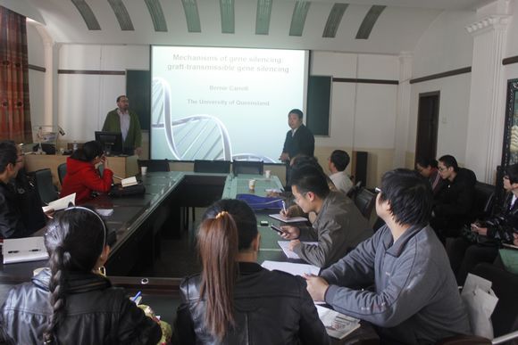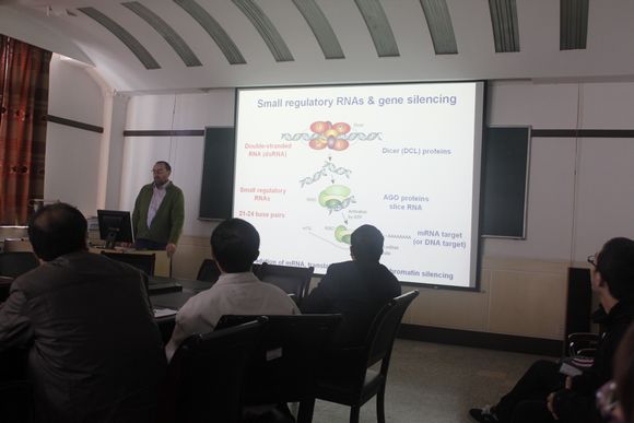 11月9日上午,前来参加2011杨凌国际农业科技论坛的昆士兰大学Bernie Carroll副教授在bat365在线平台官方网站二楼会议室为广大为师生做了题为“Graft-transmissible gene silencing in Arabidopsis”的学术报告,报告会由海江波副院长主持,农学、生命、园艺等学院40余名师生参加了报告会。Bernie Carroll教授介绍了小RNAs对基因表达的调控和基因沉默机理的研究,miRNA的产生以及在发育过程中队基因表达的调控;siRNA的产生以及在保护基因组、防止转座子的转座、防止病毒入侵和转基因沉默方面的作用机理。着重介绍了他实验室在拟南芥中通过嫁接来研究小RNA从根部来调控地上部分器官的转基因沉默的遗传调节途径,以及利用拟南芥相关基因的突变体研究基因沉默的机理。