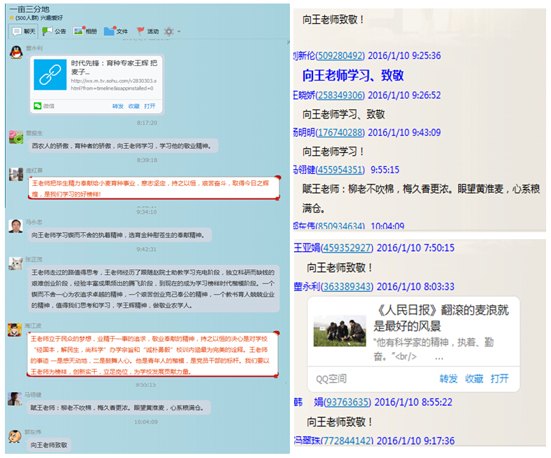 庞红喜副教授说:“王老师把毕生精力奉献给小麦育种事业,意志坚定,持之以恒,艰苦奋斗,取得今日之辉煌,是我们学习的好榜样!”