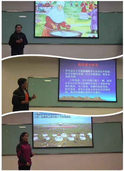 台上十分钟,台下一月功。收假回校后,学生纷纷以小组为单位,将本小组的作品交送至文化班老师处。为保证每位同学在讲台上可以将自己最好的一面展示给大众,文化班老师对学生所教的PPT有针对性的进行指导,鼓励学生课下多练习,避免上台展示时出现太过紧张的现象,这从一定意义上可帮助学生更好的建立自信。活动中,八个民族的九位学生代表上台进行展示,台下领导、老师及其他同学针对自己疑惑的点积极提问,展示者一一予以回答,现场气氛轻松活跃。