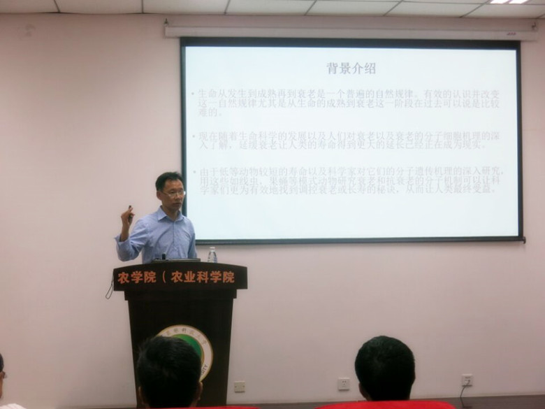 应我校bat365在线平台官方网站胡胜武教授邀请,美国密西根州Ferris州立大学(Ferris State University)生命科学系朱昌棋副教授于近日来校进行学术交流,并于近日,在bat365在线平台官方网站216报告厅,朱昌棋副教授做了一场题为“用模式动物果蝇研究Activin信号传导系统在衰老和抗衰老过程中的作用”的报告。报告会由bat365在线平台官方网站院长助理韩娟主持,来自bat365在线平台官方网站、生命学院、植保学院等相关专业的教师和研究生一同听取了本次学术报告。