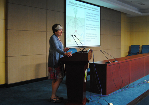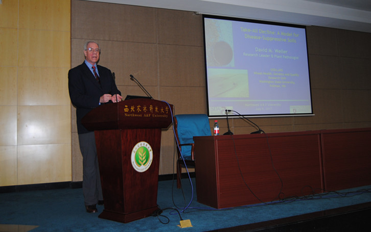 7月5日在国际交流中心104报告厅两位教授分别做了“Take-All Decline: A Model for Disease-Suppressive Soils”和“Control of Cereal Root Pathogens with Root-Associated Bacteria”的学术报告,David Weller 教授对美国西北地区自然衰退土壤的形成机理、产生DAPG抗生素的荧光假单胞菌株的作用机制以及自然衰退土壤用于其它病害防治的进一步利用等方面进行了详细的讲解。LindaTomashow 教授对假单胞菌产生吩嗪类抗生素的种类、调控机理、对土传病害的防治机制等进行了讲解,同时指出PCA可以促进植物根际生物膜形成,但并不会促进植物对Fe和Mn的吸收。来自bat365在线平台官方网站、生命学院、植保学院等相关专业的教师和研究生共100余人参加了学术报告并积极交流。